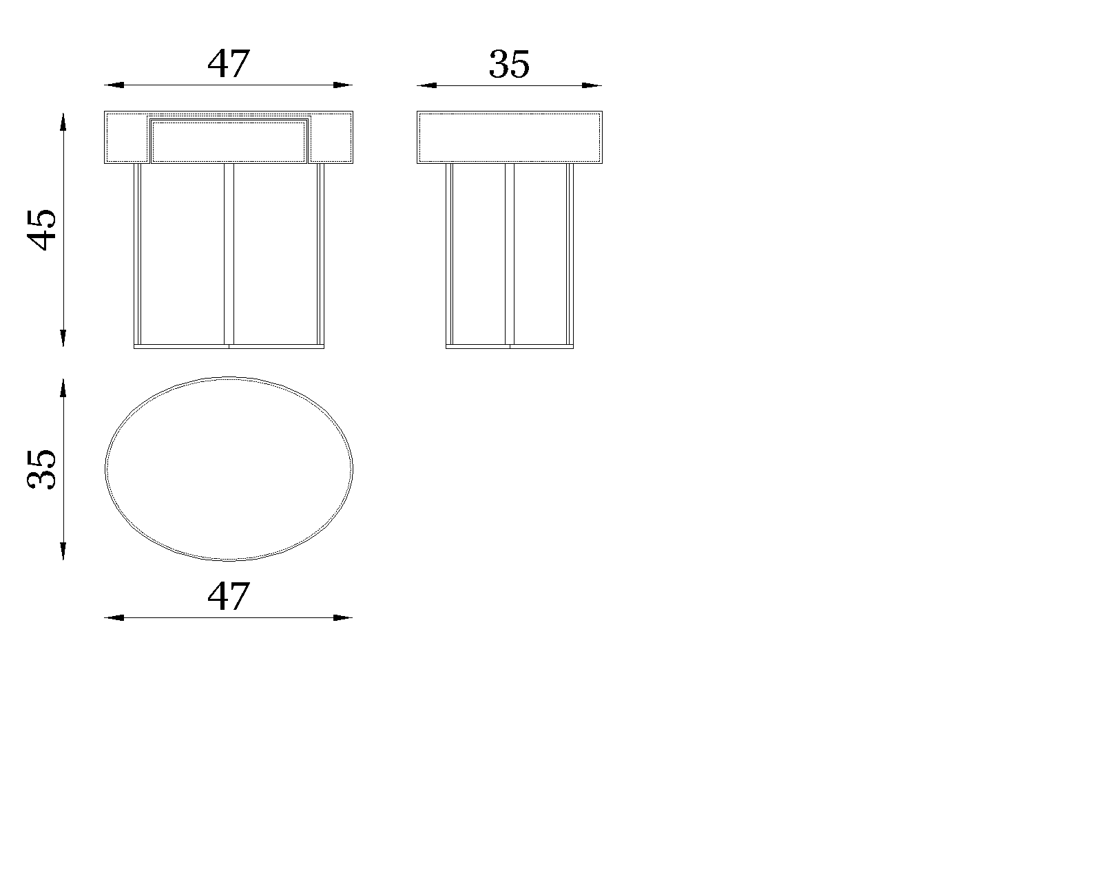 Elemento caratterizzante è la base in metallo lucido, una struttura slanciata che sostiene il corpo del comodino con un segno grafico distintivo. Le gambe si incontrano con un disegno a croce asimmetrica, creando una presenza leggera ma dinamica, che valorizza il contrasto tra la solidità del volume superiore e la trasparenza visiva della parte inferiore.