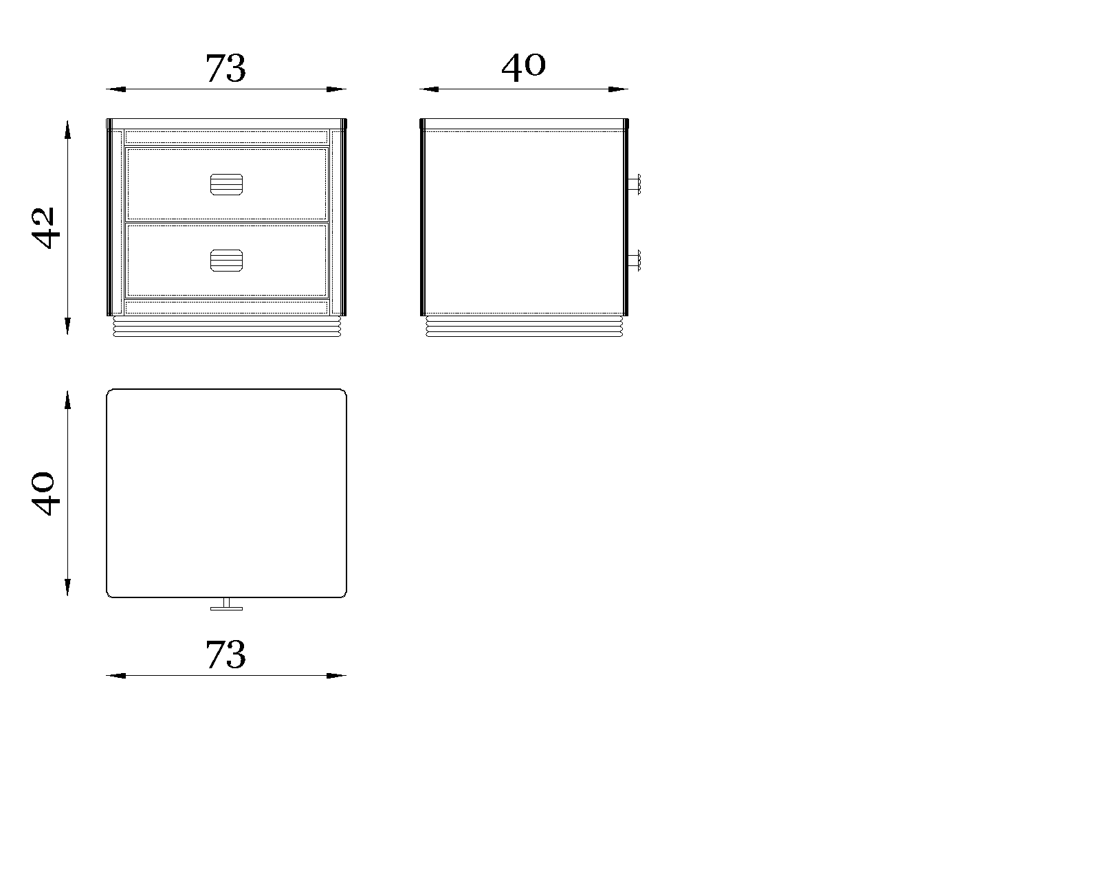 Il fronte è definito da due cassetti essenziali, impreziositi da maniglie in ottone lucido dal disegno iconico, piccoli accenti gioiello che aggiungono ritmo e personalità. Il contrasto tra materiali naturali e finiture metalliche crea un gioco di percezioni tattili e visive, esaltando la ricercatezza del dettaglio.