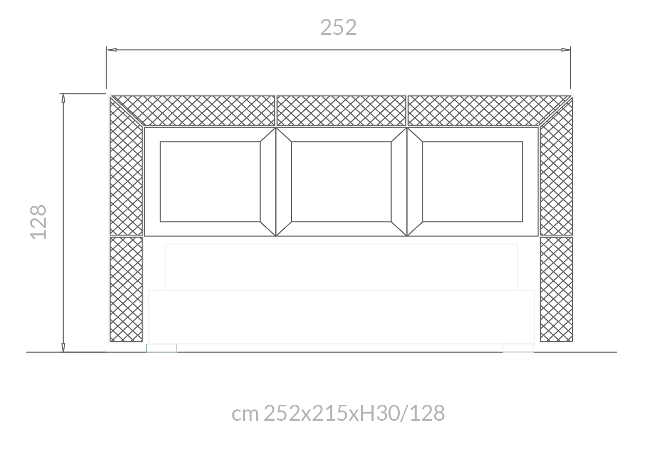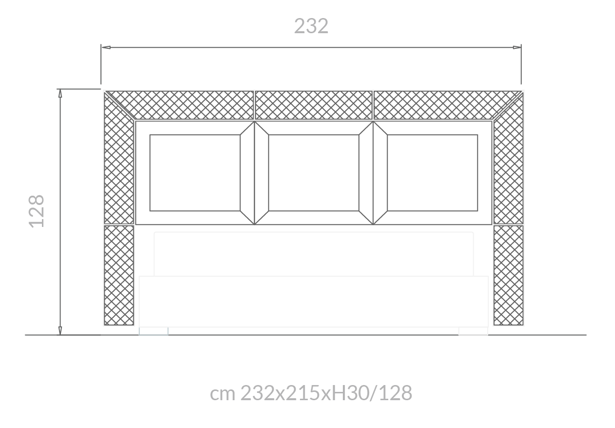 Testata con bugne imbottite e cornice rivestita. Dettagli in metallo. Giroletto rivestito.