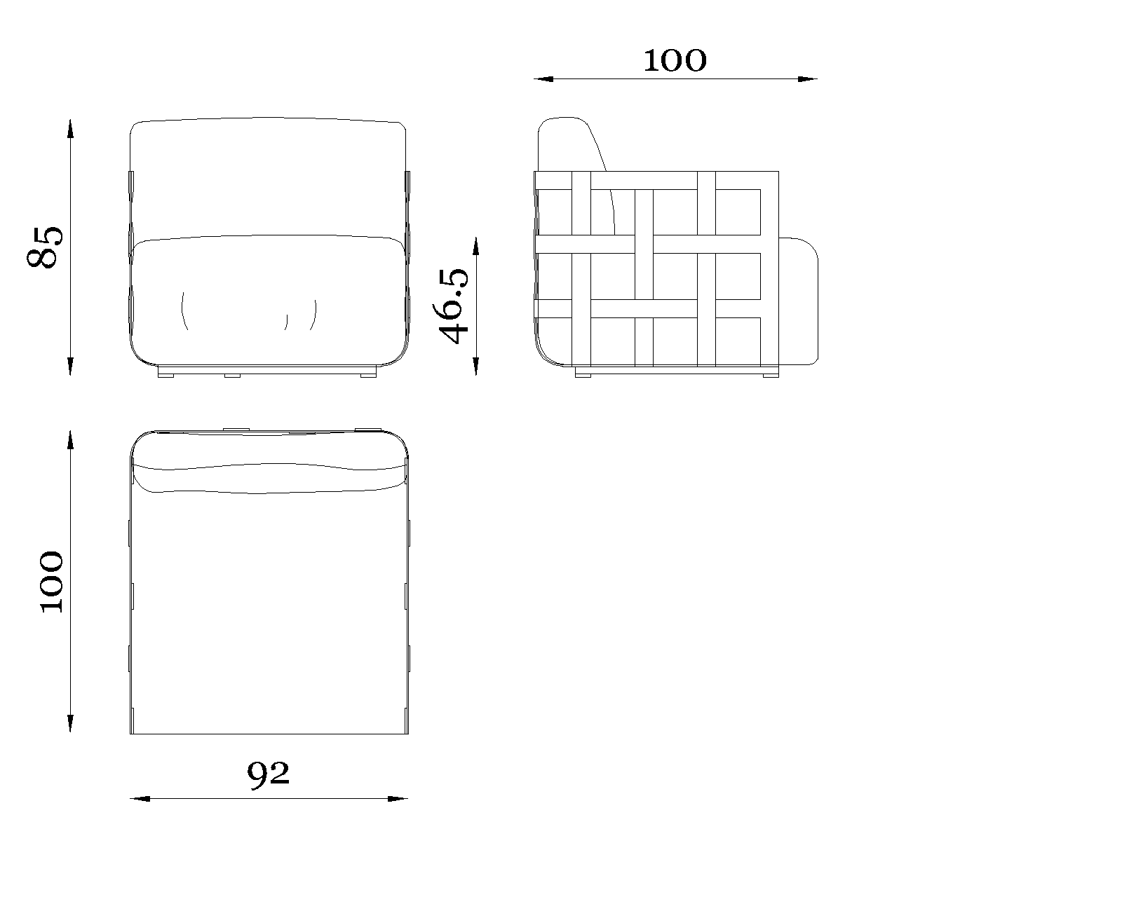 La seduta, ampia e generosa, si sviluppa con forme morbide e leggermente arrotondate che contrastano con il segno deciso dell’intreccio laterale. Lo schienale accoglie il corpo con una superficie continua e confortevole, pensata per favorire una postura rilassata e naturale. L’assenza di spigoli e la continuità delle linee contribuiscono a definire un’estetica equilibrata, in cui pieni e vuoti si alternano con armonia, alleggerendo visivamente la struttura.