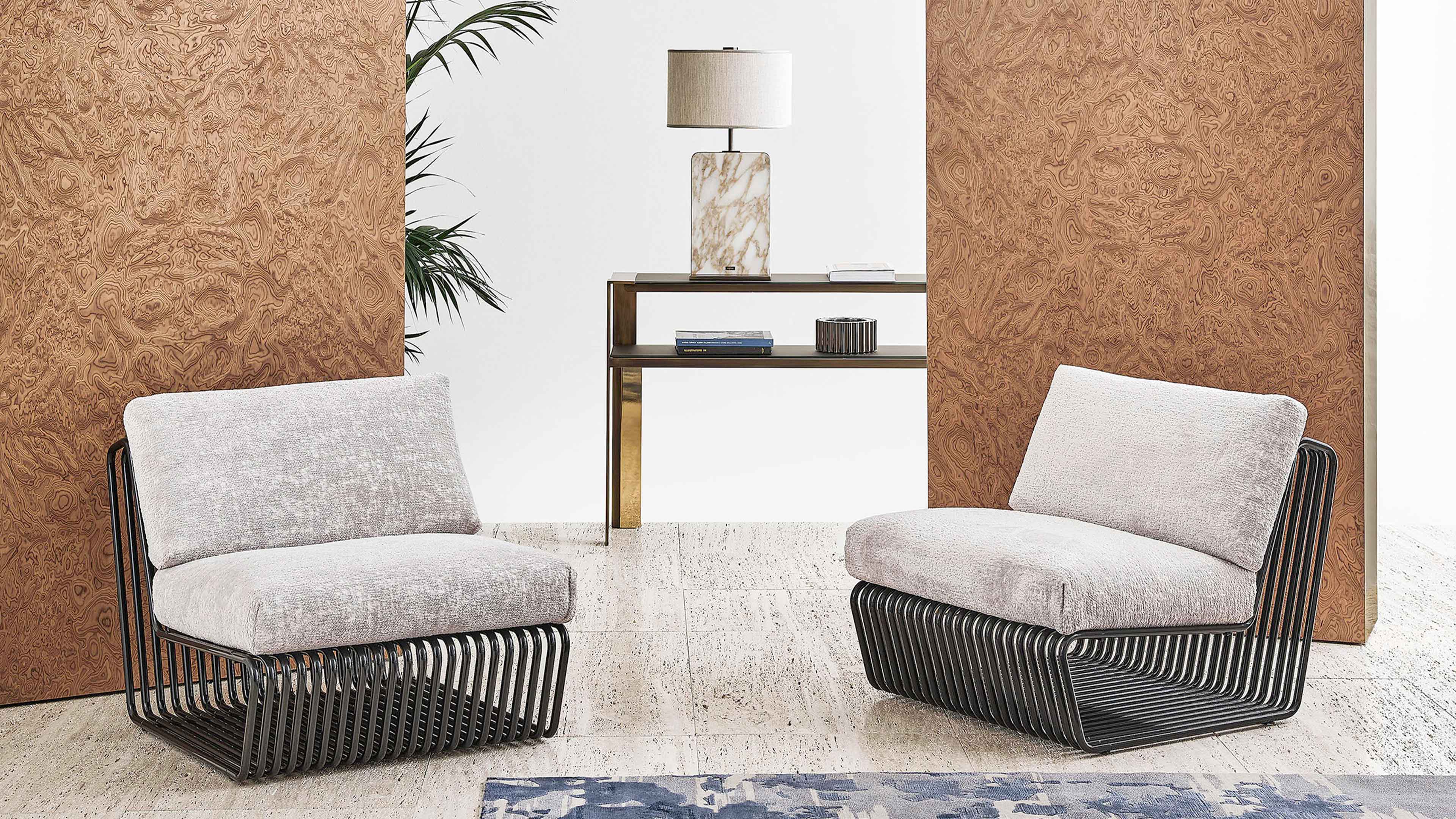 La serie di tubolari accostati e curvati da vita alla seduta, resa confortevole dai cuscini seduta e schienale. Struttura disponibile in oro lucido o cromo nero.