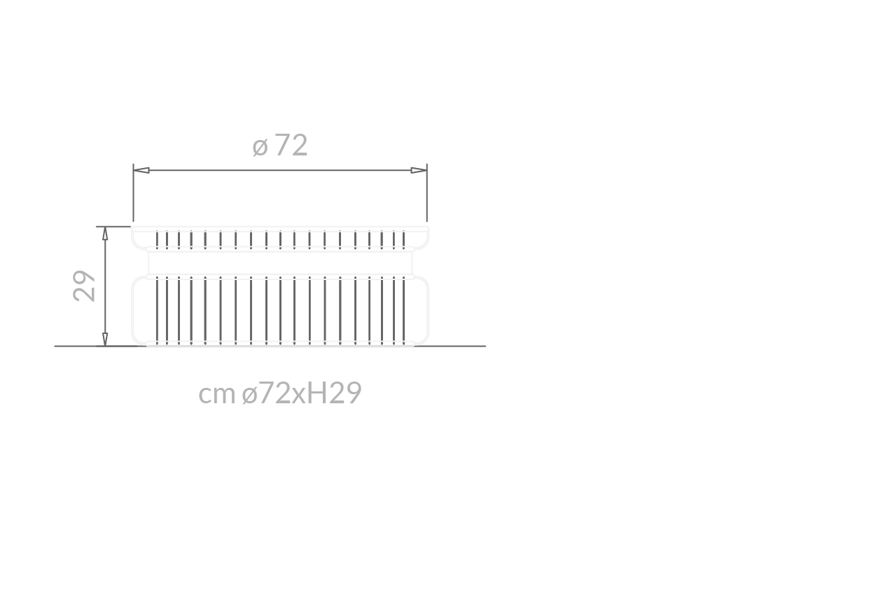 Collezione di tavolini in diverse misure e altezze. Base caratterizzata da una sequenza regolare di tondini in metallo.